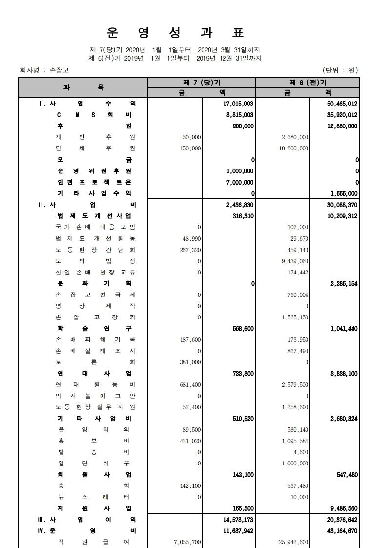 회원여러분께 2020년 1.4분기(1월~3월) 손잡고 재정사용내역을 보고드립니다.