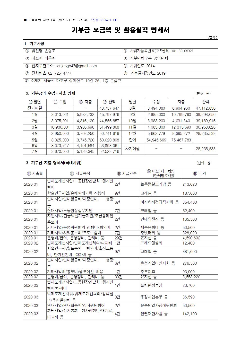 [공지] 2020년도 기부금 모금액 및 활용실적 명세서