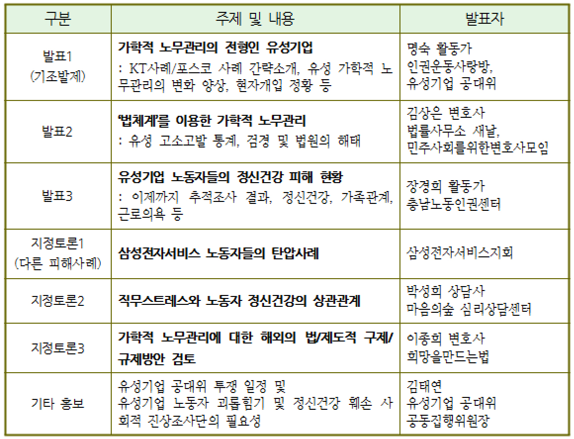 -. 이에 가학적 노무관리의 대표적 기업인 유성기업의 사례를 중심으로 가학적 노무관리의 실태를 짚고 이에 대한 사회적 제재를 함께 논의하는 <전쟁 같은 일터, 당장 멈춰-노동자의 존엄과 생명 을 파괴하는 가학적 노무관리에 대해> 토론회를 열고자 합니다.